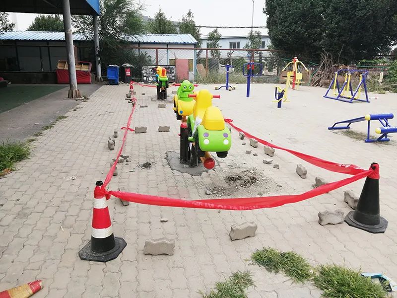 施工過(guò)程中,安裝工人們認真地將蹺蹺板移動(dòng)到指定位置,利用榔頭、錘子、鐵錐等專(zhuān)業(yè)工具將花磚地面進(jìn)行鑿除和清理,將混凝土均勻地鋪設在指定位置,以達到固定蹺蹺板的效果。