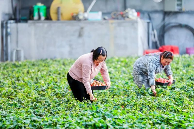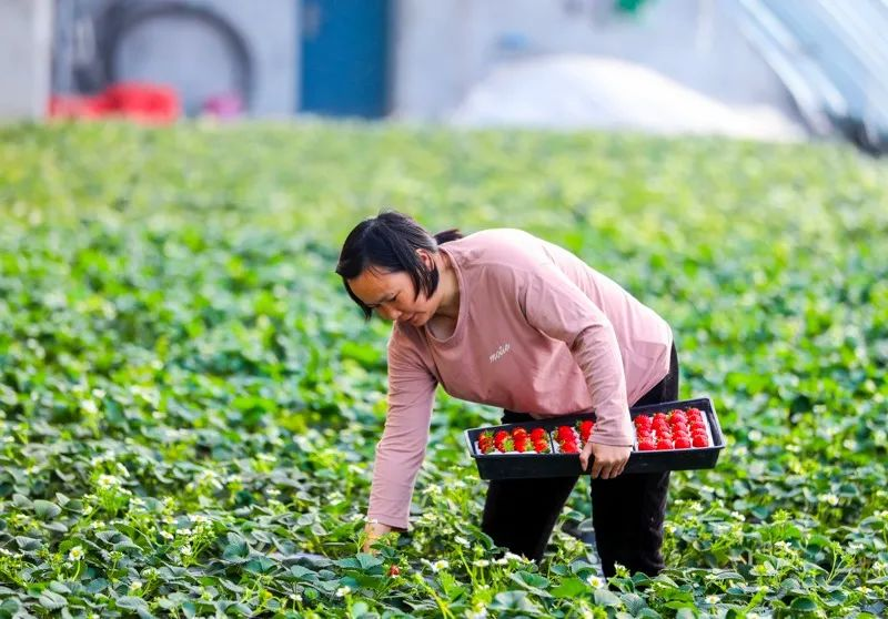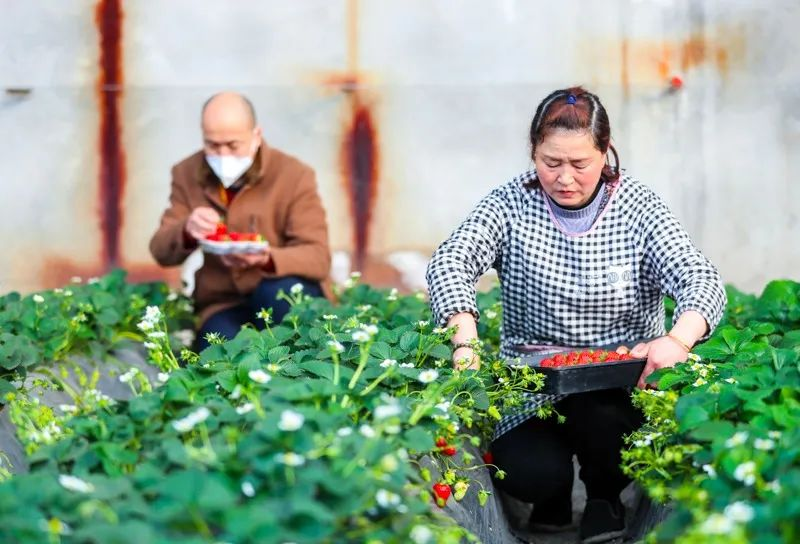 2月14日,在安寧渠塞外水鄉度假村的草莓種植大棚,工作人員正在采摘成熟草莓
