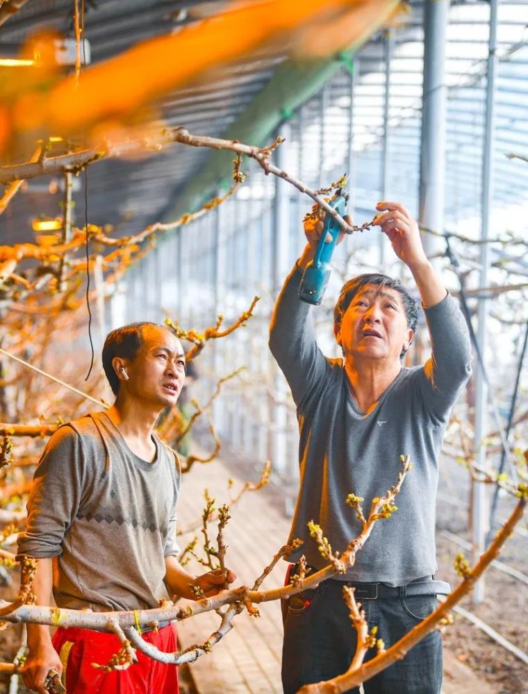 2月14日,位于烏魯木齊高新區(新市區)安寧渠鎮的塞外水鄉生態(tài)農場(chǎng)員工在大棚修剪櫻桃樹(shù)