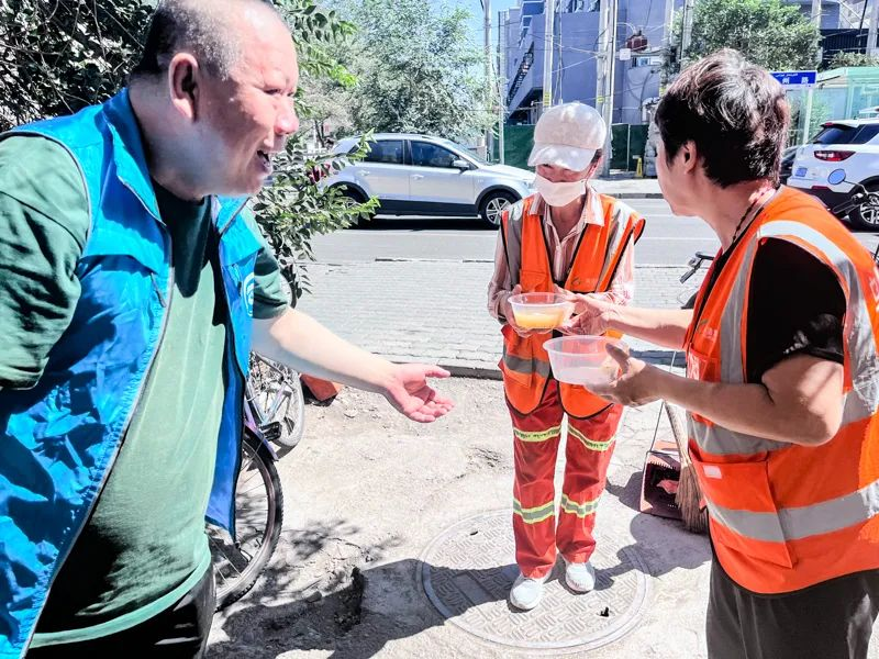 社區網(wǎng)格員為環(huán)衛工人分發(fā)綠豆湯