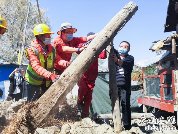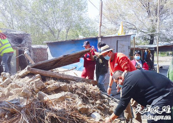 了解到這一情況后,“訪(fǎng)惠聚”工作隊第一時(shí)間與安新社區和中建新疆建工機場(chǎng)交通中心黨支部取得聯(lián)系。4月29日,中建新疆建工機場(chǎng)交通中心黨支部、安新社區和“訪(fǎng)惠聚”工作隊20余名黨員干部一起來(lái)到木塔里普·賽買(mǎi)提家中,幫助他們清理院中的坍塌物。