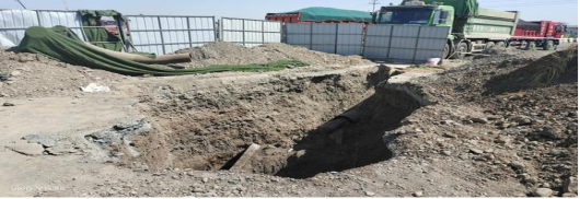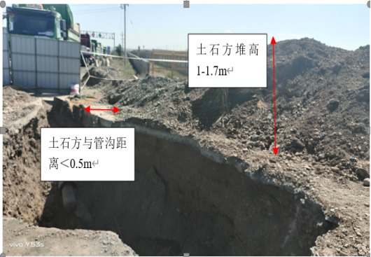 5. 管溝內縱向與橫向分布有高低待碰接的燃氣管道,管徑為DN300mm,保護管徑為DN500mm,管溝外堆放有待焊接配件彎管。施工管溝處于烏昌輔道T4機場(chǎng)改擴建工地西4門(mén)西側道路與烏昌輔道路口交匯處南側水泥鋪裝路面上,路面側方設有2m高的施工圍蔽,圍蔽距離施工管溝1.8—2.2m,內側堆有土石方和燃氣彎管,外側有水泥隔離墩和燃氣管道配件、隔離護欄、錐桶等設施,未見(jiàn)危大工程現場(chǎng)告知牌、警示標志和隱患排查治理情況公示牌。圍蔽外側時(shí)有拉運土石方的重型自卸車(chē)、灑水車(chē)等各種工程機械、車(chē)輛駛過(guò)。