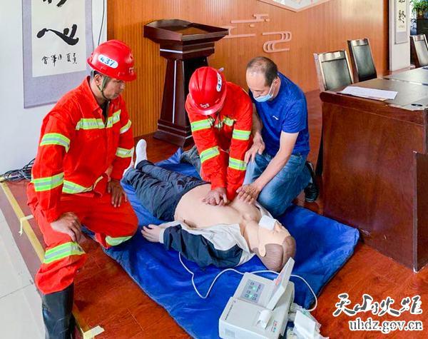 “輕拍昏迷者雙肩,判斷是否有意識。觀(guān)察胸部是否有起伏,判斷是否有呼吸。如果沒(méi)有,就采用雙手疊扣法,對準雙乳中間按壓……”在五建社區會(huì )議室,國家應急礦山救護基地(新疆)隊員向居民演示如何在突發(fā)情況下做心肺復蘇。
