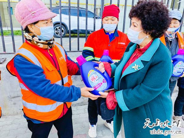 活動(dòng)結束后,第一書(shū)記帕提古麗·肉孜為付出辛勤勞動(dòng)的環(huán)衛工人送上精心準備的慰問(wèn)禮品,感謝他們一直堅守在崗位上,寧愿一人臟,換來(lái)萬(wàn)人潔,為城市默默奉獻。