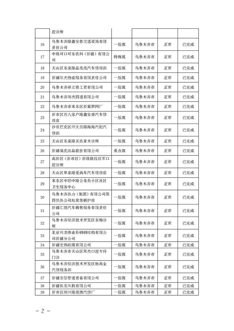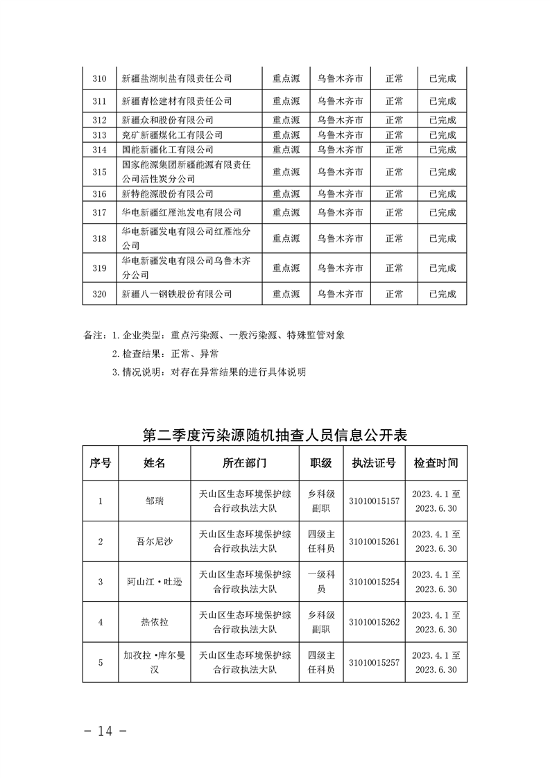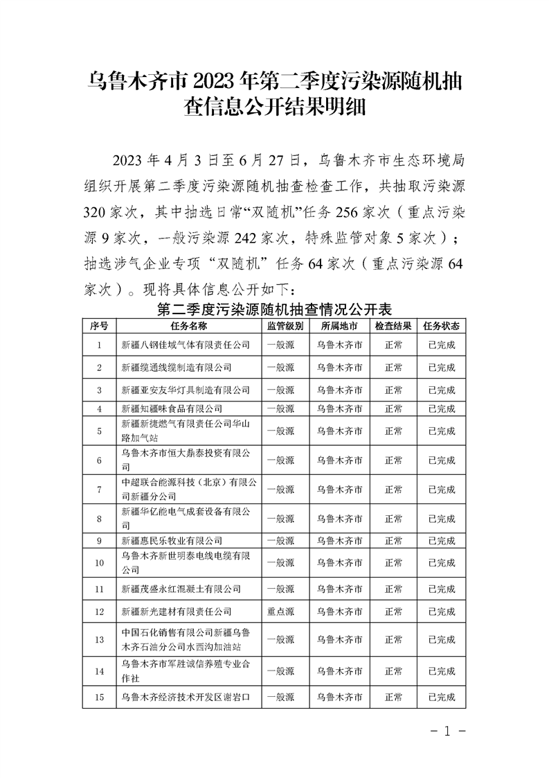 烏魯木齊市2023年第二季度污染源隨機抽查信息公開(kāi)結果明細
