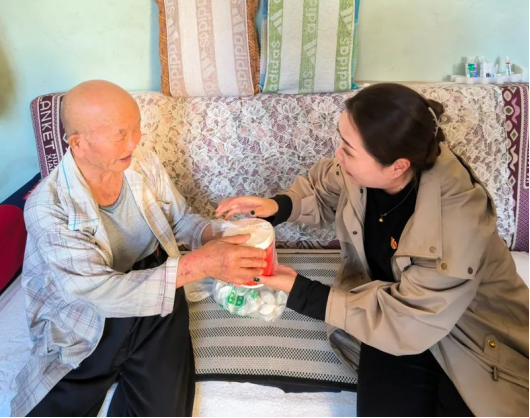 京疆路社區黨委書(shū)記陳婧為高齡老人送去社區干部自己動(dòng)手制作的餃子和養生粥