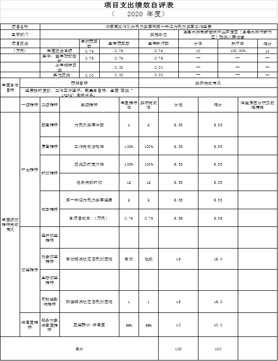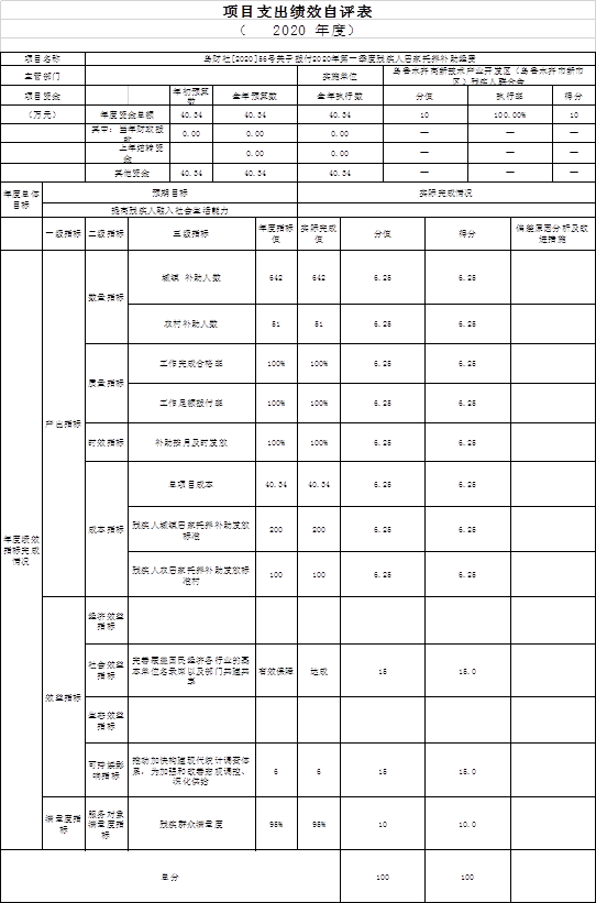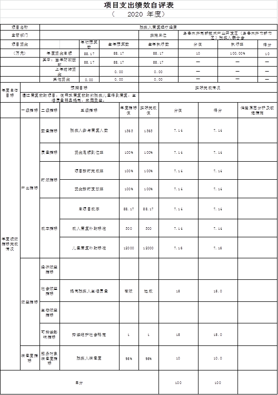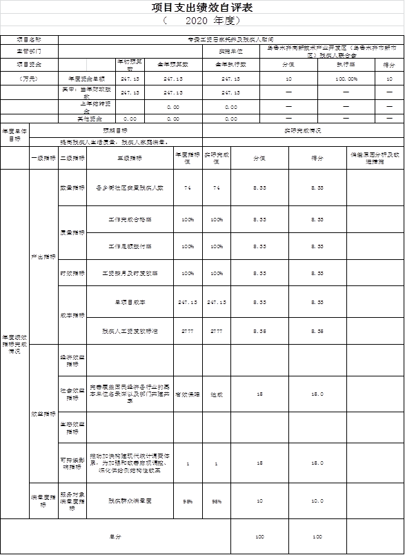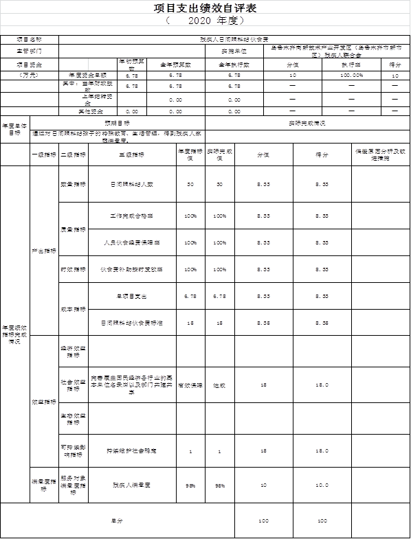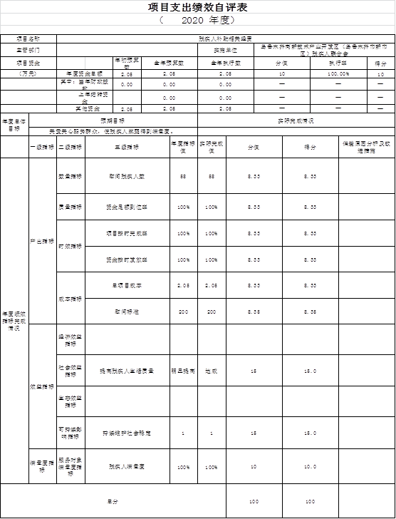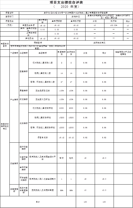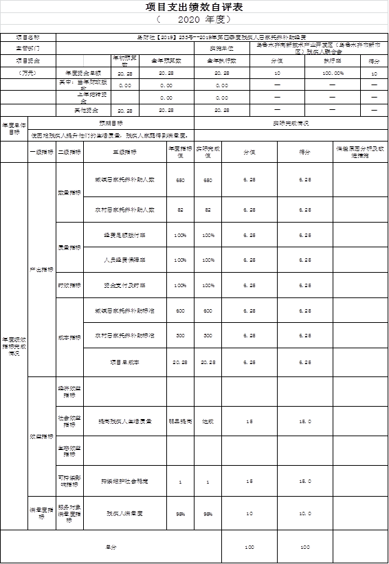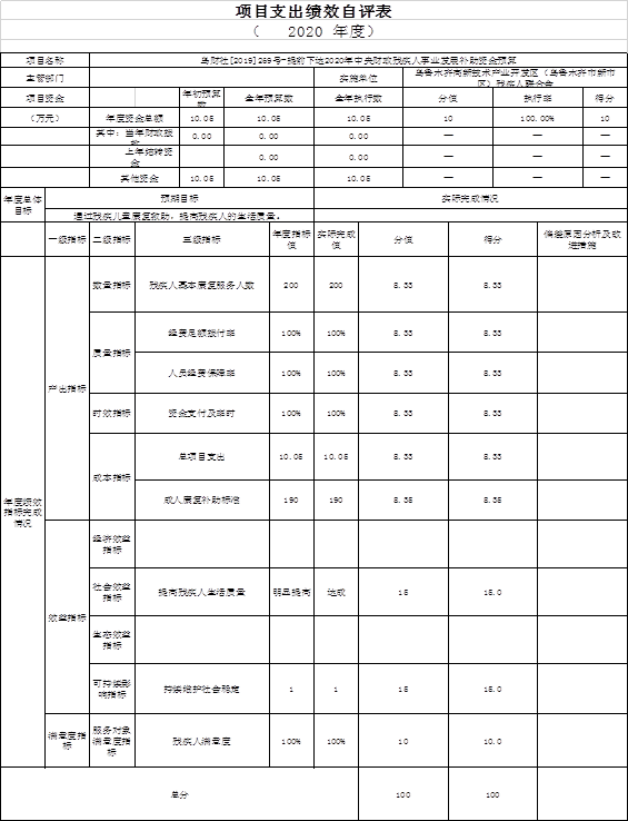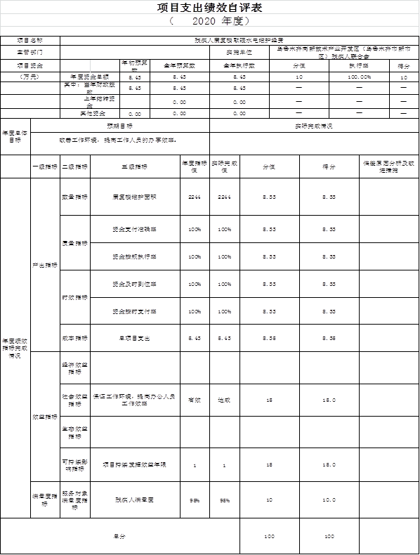 根據預算績(jì)效管理要求,我單位2020年度開(kāi)展預算績(jì)效評價(jià)項目15個(gè),共涉及資金557.84萬(wàn)元。預算績(jì)效管理取得的成效:一是項目完成后達到了預期效果;二是為殘疾人自謀職業(yè)進(jìn)行扶持,鼓勵更多殘疾人自強不息;殘疾人康復得到需求,提高了殘疾人生活質(zhì)量。加強領(lǐng)導,落實(shí)殘聯(lián)工作目標管理責任制;三是發(fā)揮作用,全力做好為殘疾人服務(wù)。發(fā)現的問(wèn)題及原因:一是加強領(lǐng)導,落實(shí)殘聯(lián)工作目標管理責任制;二是發(fā)揮作用,全力化解矛盾糾紛。下一步改進(jìn)措施:一是建檔立冊,完整備查;二是按照管理辦法,規范專(zhuān)項資金的管理使用;三是繼續為廣大殘疾人服務(wù)提供更好地平臺,讓更多的殘疾人受益。具體項目自評情況附項目支出績(jì)效自評表。