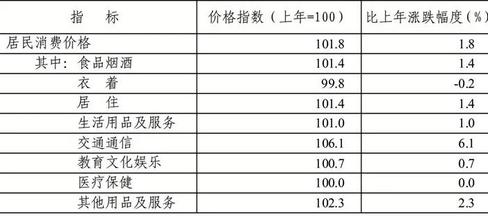 全年居民消費價(jià)格(CPI)比上年上漲1.8%。