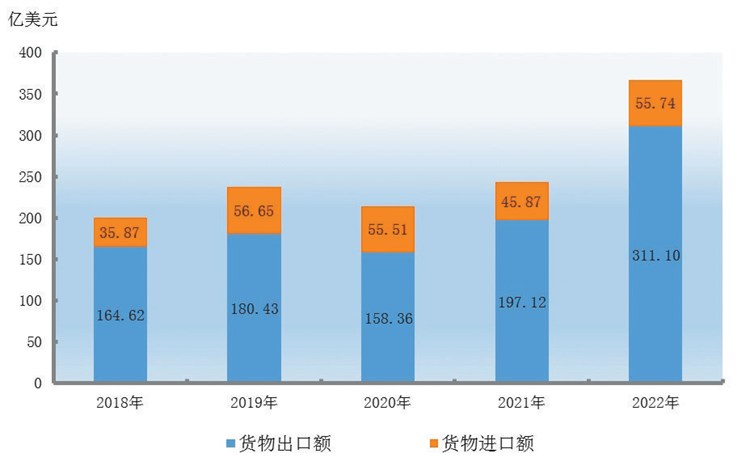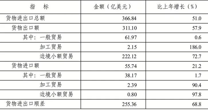 全年貨物進(jìn)出口總額366.84億美元,比上年增長(cháng)51.0%。其中:出口311.10億美元,增長(cháng)57.9%;進(jìn)口55.74億美元,增長(cháng)21.2%。貨物進(jìn)出口順差(出口減進(jìn)口)255.36億美元,比上年增加104.11億美元。按登記注冊類(lèi)型統計,國有企業(yè)進(jìn)出口28.24億美元,比上年下降11.7%;外商投資企業(yè)2.15億美元,增長(cháng)91.4%;民營(yíng)企業(yè)336.33億美元,增長(cháng)60.3%。