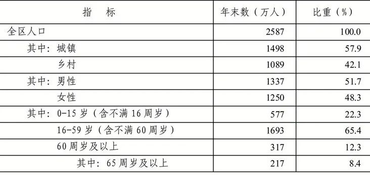 年末全區常住人口2587萬(wàn)人,其中:城鎮常住人口1498萬(wàn)人。城鎮化率為57.89%,比上年末提高0.63個(gè)百分點(diǎn)。全年出生人口16.9萬(wàn)人,出生率6.53‰;死亡人口14.9萬(wàn)人,死亡率為5.76‰;自然增長(cháng)率為0.77‰。