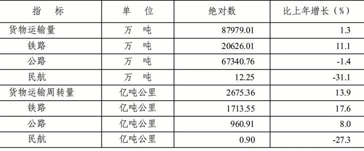 全年貨物運輸量87979.01萬(wàn)噸,比上年增長(cháng)1.3%。貨物運輸周轉量2675.36億噸公里,增長(cháng)13.9%。