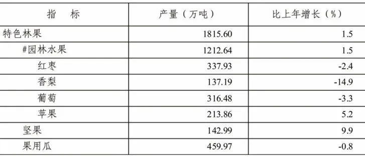 全年特色林果產(chǎn)量1815.60萬(wàn)噸,比上年增產(chǎn)1.5%。其中:園林水果產(chǎn)量1212.64萬(wàn)噸,增產(chǎn)1.5%;堅果產(chǎn)量142.99萬(wàn)噸,增產(chǎn)9.9%;果用瓜產(chǎn)量459.97萬(wàn)噸,減產(chǎn)0.8%。